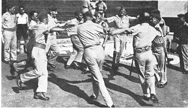 Jewish soldier settlers dancing the Hora in Palestine, 1948