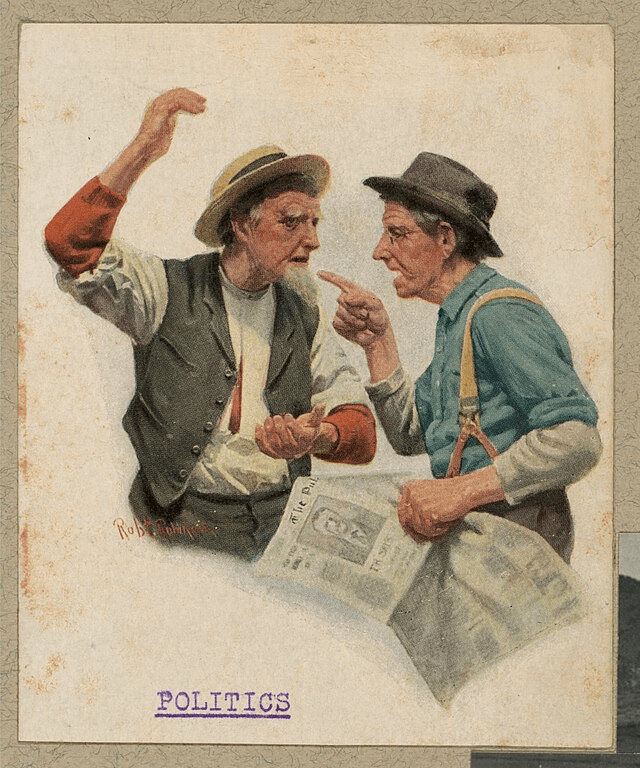 Two rural men argue about politics. A picture of Teddy Roosevelt is on the front page of a newspaper one of the men is holding.